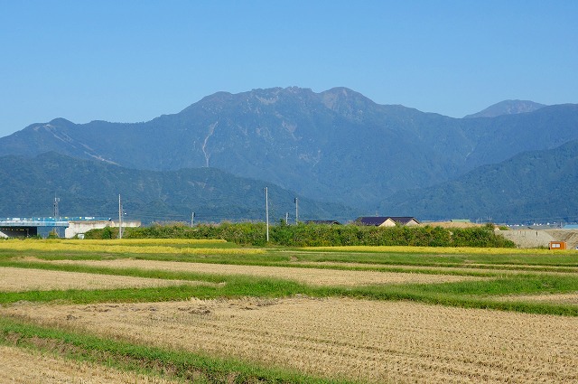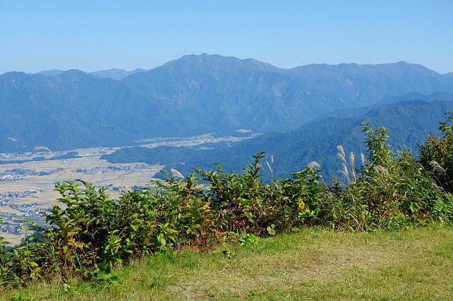 魚沼盆地の向こう側に、越後の山々が聳えています。