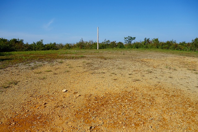 展望台には柱が一本立っているだけで、他には何もない広い丘でした。西側は木が茂っていて視界がないのが残念ですが、東側には越後の山々の展望が広がります。