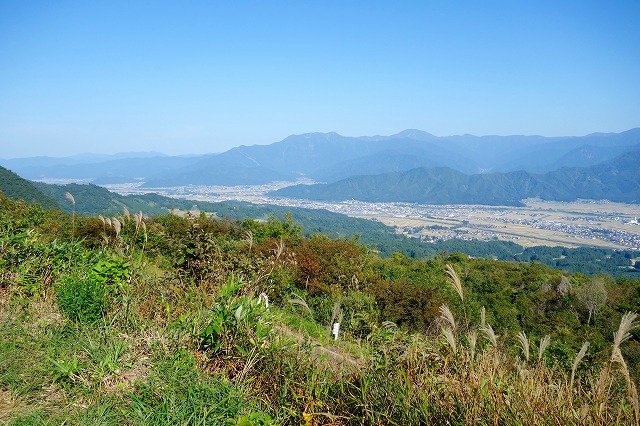展望台を過ぎるとしばらく下り道が続きますが、その後は所々で盆地の景色が開ける中、稜線に沿ってなだらかな道を進んでいきます。