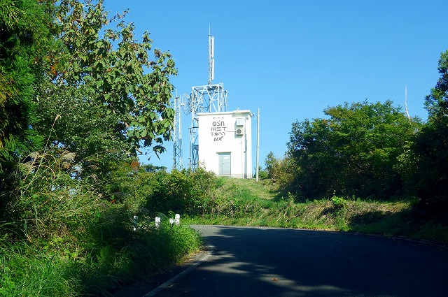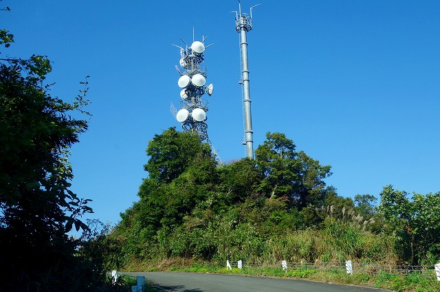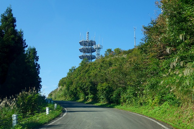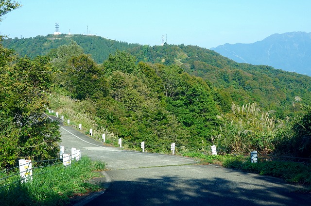 八箇峠見晴台を過ぎると道は急カーブの連続になり、一気に麓へと下っていきます。先ほど通り過ぎた桝形山のアンテナ群も、見上げるような高さになります。