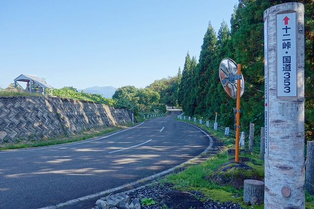 コンビニのあるT字路を右折して登っていき、峠のトンネルを抜けると大きな看板の立つ「十二峠入口」があります。