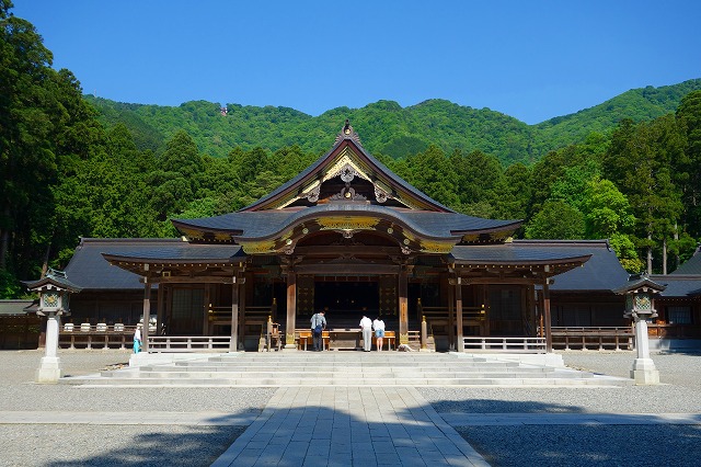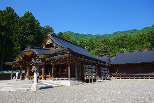 「二の鳥居」からさらに進むと、楼門の先に、弥彦山を背景にして大きな「拝殿」が鎮座していました。境内は整えられた美しい佇まいです。