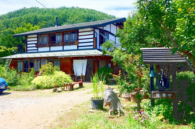 店がある朝日村は、鉢盛山の麓に広がる高原野菜などの栽培が盛んな農業の村で、周囲にはそうした野菜畑が広がり、北に安曇野を見渡す山里です。