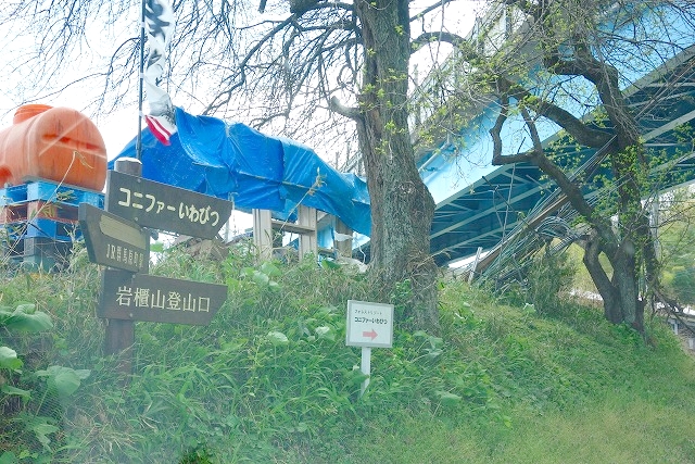 国道が高架橋になる手前に左に分かれる道があり、「岩櫃山登山口、岩櫃城跡」と書かれた案内板があるので、案内に沿って左折します。