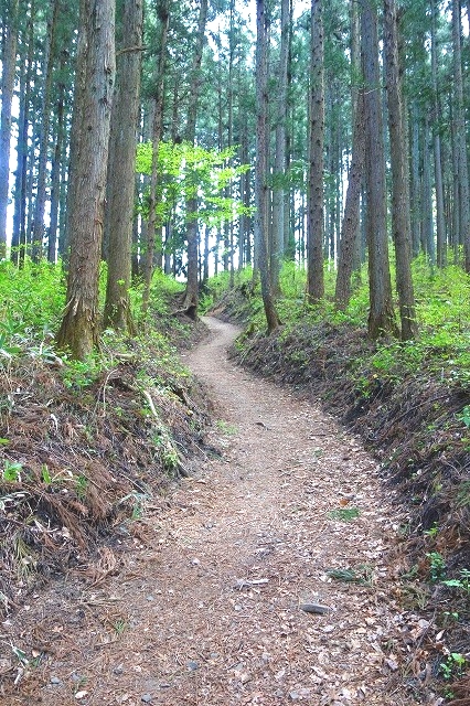 「コニファーいわびつ」への分岐を過ぎると道は沢筋を離れ、やがて杉林の中の道になります。