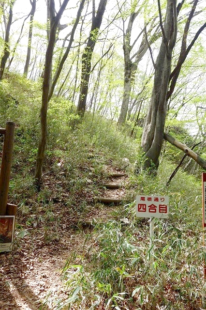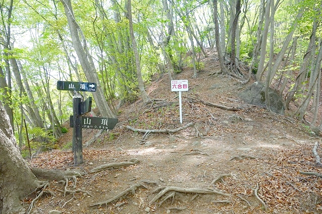 尾根を回り込んで登り切ったところが「六合目」で、ここで郷原方面からの「赤岩通り」の道が合流してきます。