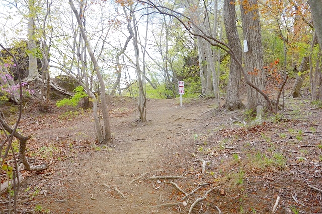 尾根伝いに登ることもできるようですが、そちらにはロープが張られ、立入禁止の表示と「正規のルートをお進みください」という案内がされていました。