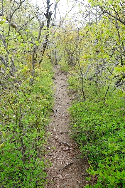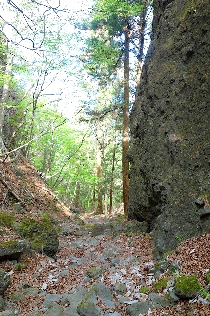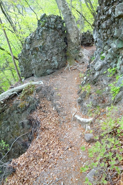 岩の回廊といった感じの巨石の谷間を通っていきます。展望はないですが、尾根上のような危険な場所はない道です。