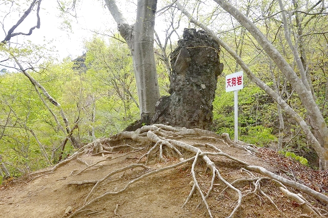 やせた尾根をしばらく行くと、「天狗岩」が見えてきます。尾根の上に棒状の大きな岩が立っています。
