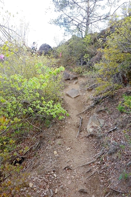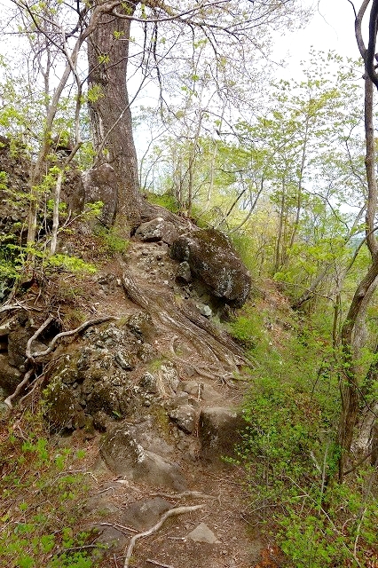 引きで撮影できないのでわかりにくいのですが、尾根上の道は写真のような感じで、岩の上を辿っていきますが道ははっきりしています。周囲は樹木に覆われているので、高度感はあまり感じません。