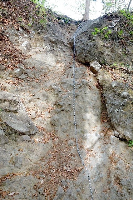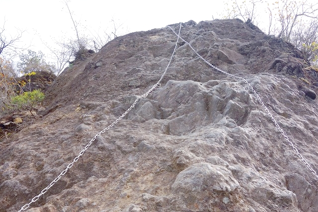 この登山道の中で一番大きな岩場ですが、ここには2本の鎖が設置されていて登るのは難しくありません。