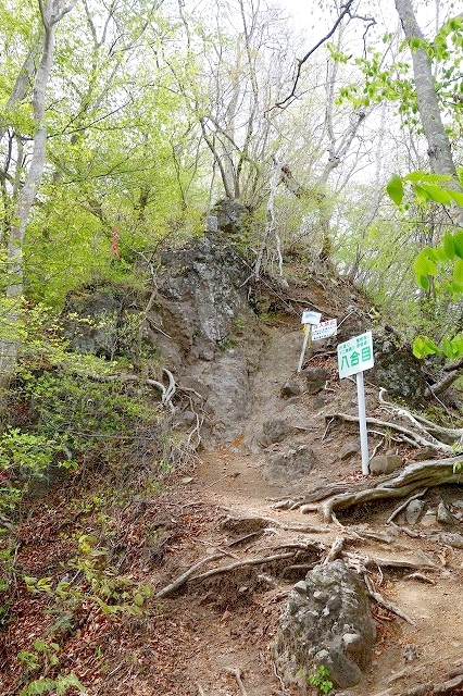 「岩櫃城跡」まではなだらかで整備された道ですが、その先はやせた尾根の登山道で岩場も出てきます。