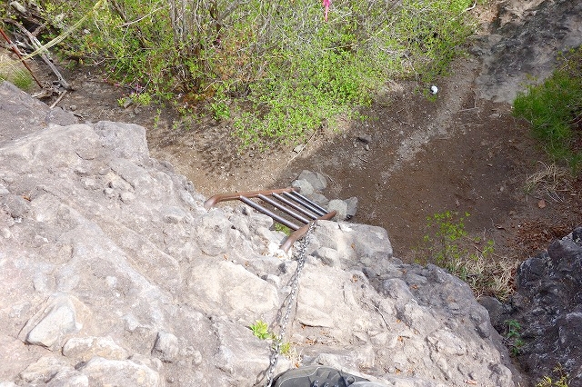 九合目のピークから鎖とハシゴを使っていったん鞍部へ下り、山頂を目指します。