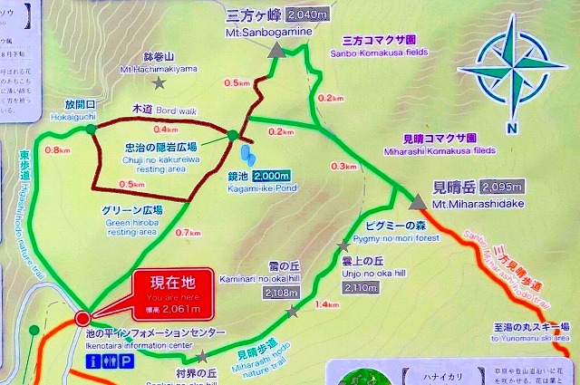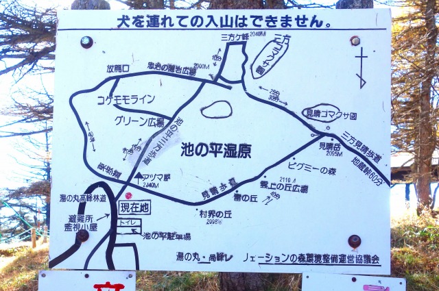 湿原への入り口に案内板があり、この地図とインフォメーションセンター前の地図が分かりやすいので、写真の撮っておくと便利です。