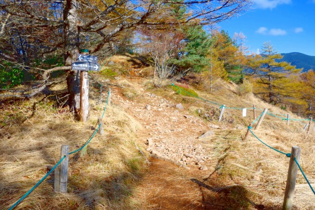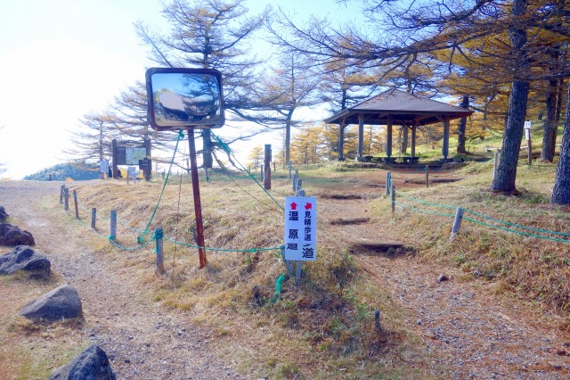 まっすぐ進めば火口原の「湿原」へ。右に進めば外輪山の上を歩く「見晴歩道」になります。