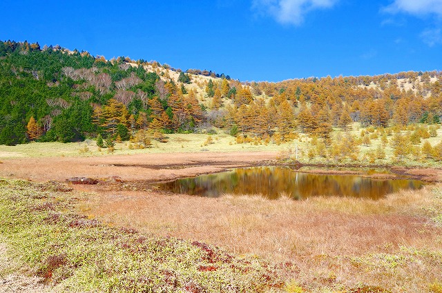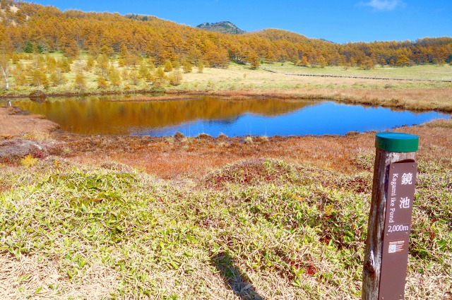 鏡池は湿原の端にある小さな池で、この一帯だけは水分があるようです。