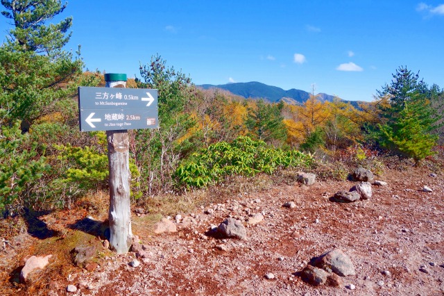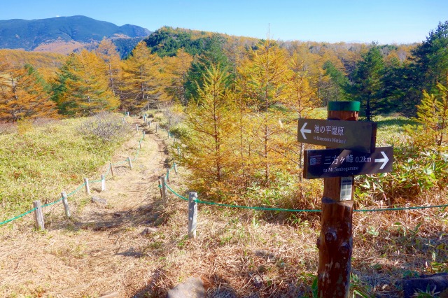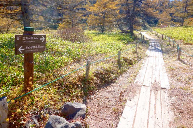 分岐から真っ直ぐ進めば「三方ヶ峰」方面へ、左へ曲がると「放開口」方面への木道が続いています。