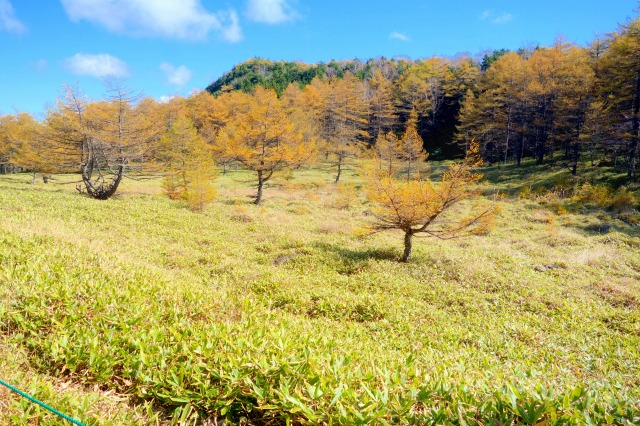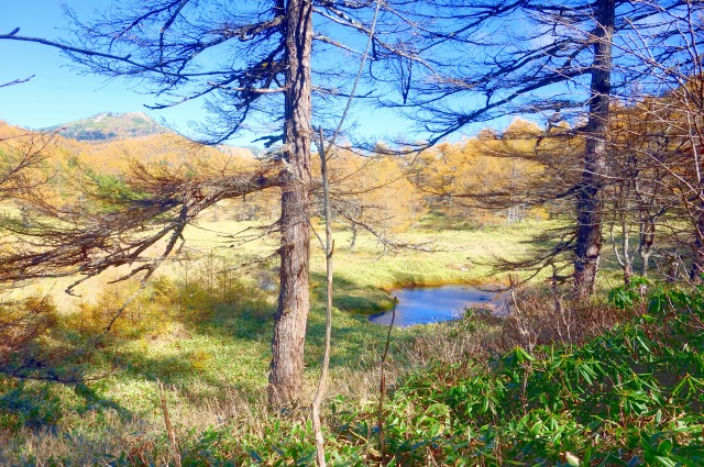 やがて木々の間から、火口原の湿原が見えてきます。