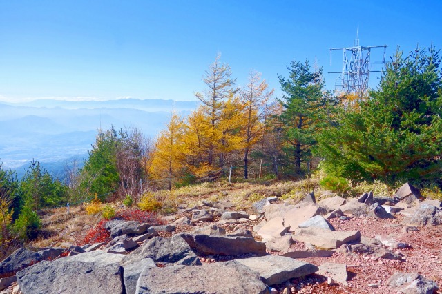 見晴岳の山頂にはアンテナ塔があり、樹林のない山頂からは、周囲の景色が広がります。