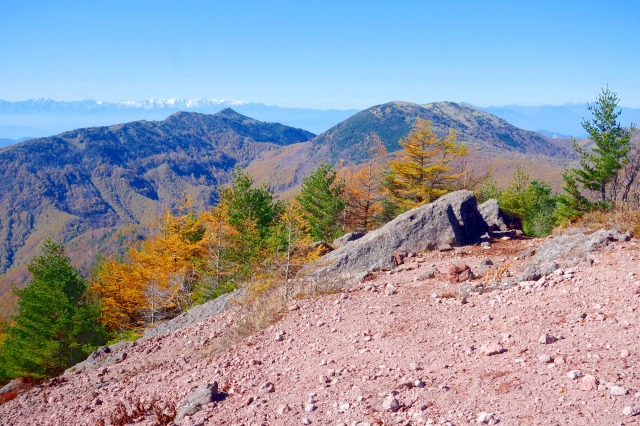 ポコポコと溶岩ドームが連なるその彼方には、四阿山や横手山などが見えていました。