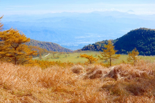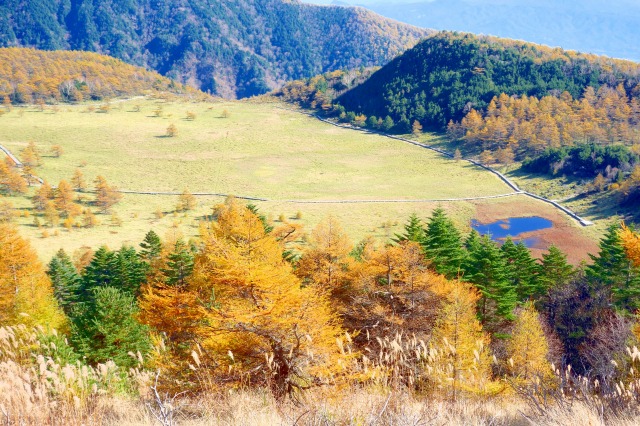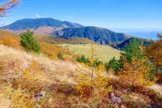 火口原の湿原の周囲は外輪山が取り囲んでいて、稜線上には登山道が整備されており、こちらからの景色は、富士山から南アルプス、八ヶ岳、北アルプス、上越の山々までを望む大絶景が広がっています。