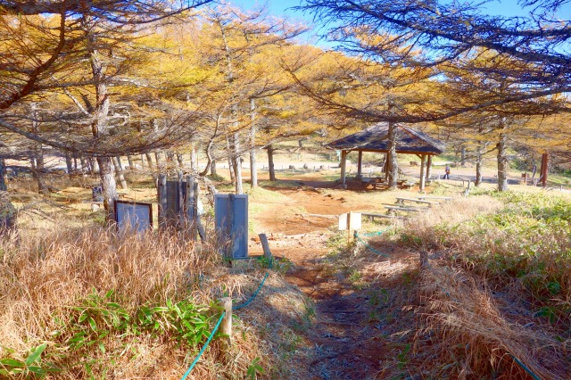 村界の丘からなだらかな坂道を下っていくと、コマクサ峠の東屋の前に戻ってきます。