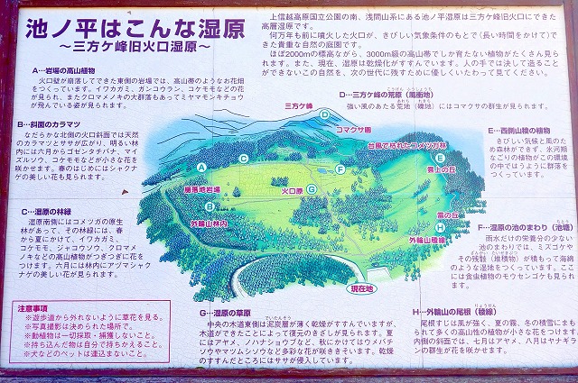 湿原への入り口であるコマクサ峠にある案内板によると、池の平湿原は別名「三方ヶ峰旧火口湿原」というようで、三方ヶ峰火山の旧火口にできた高層湿原だそうです。