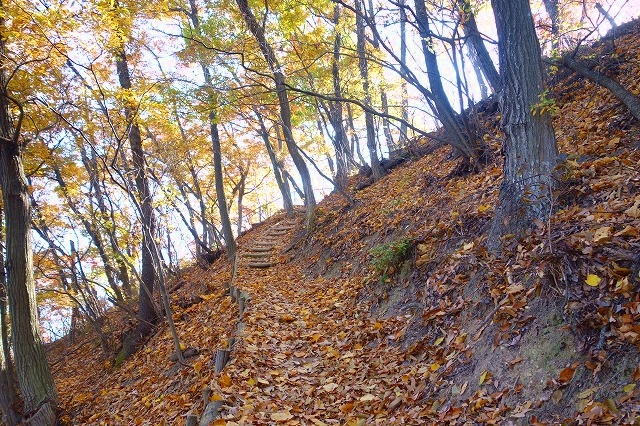 道は整備されていて歩きやすいです。足元は一面の落ち葉で覆われていて、落ち葉を踏みしめながら登っていきます。