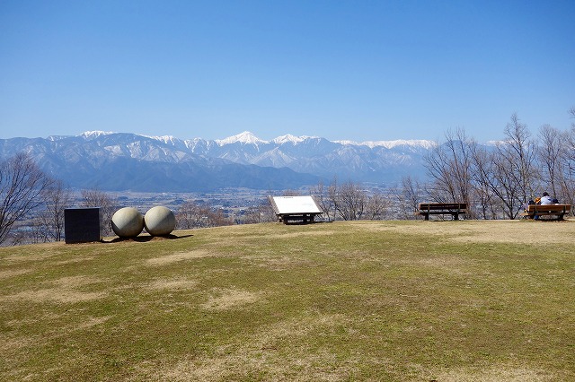 安曇野を広く見渡し、その向こうにはまだ雪をたっぷりと残したアルプスの峰々が輝いています。乗鞍岳も少しだけ頭を出していました。