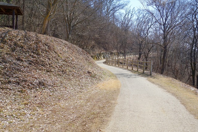 この遊歩道はこれまでの山道と違い、簡易舗装された歩きやすい道で、山の西斜面を北入口から公園中心部まで通っています。