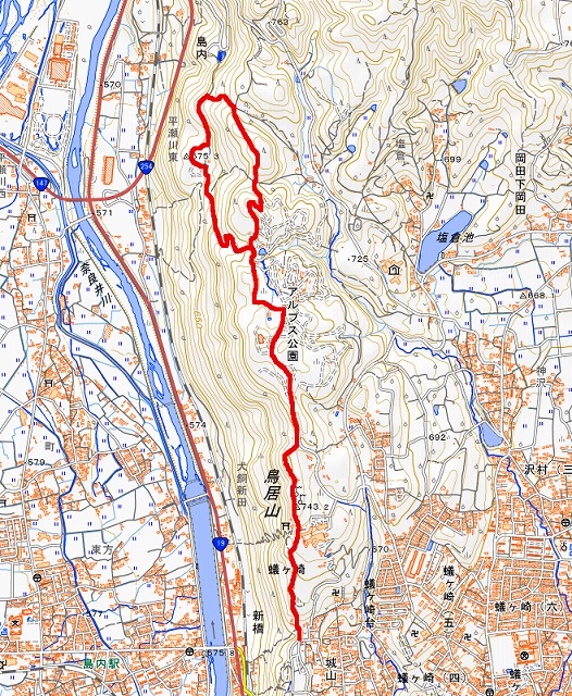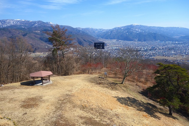 今回のコースは、安曇野の東端を南北に走る山並みの上を歩くルートです。スタート地点は山の南端にある「城山公園」にしました。ここから北上していきます。