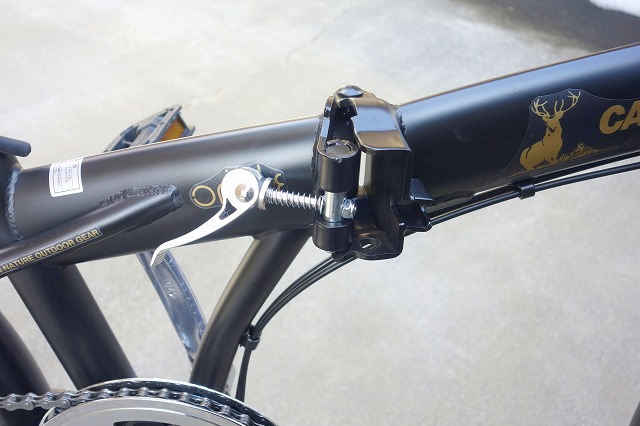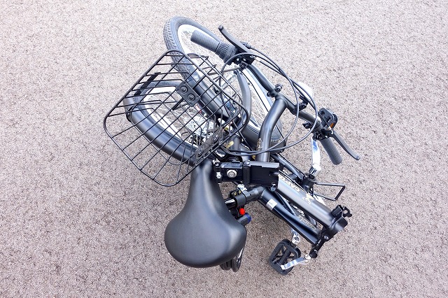 この自転車の畳み方は、フレームを二つ折りにし、さらにハンドルも二つに折るタイプで、レバーを操作するだけで簡単に組み立て、折り畳みができます。