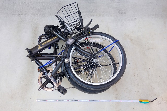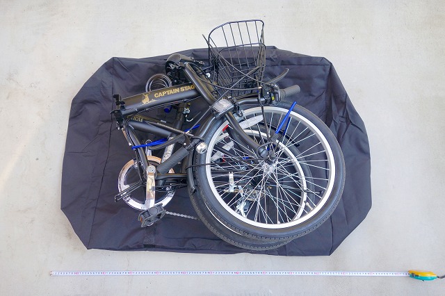 小さくて見えづらいのですが、折り畳んだサイズがわかるように、メジャーを置いた写真も載せておきます。