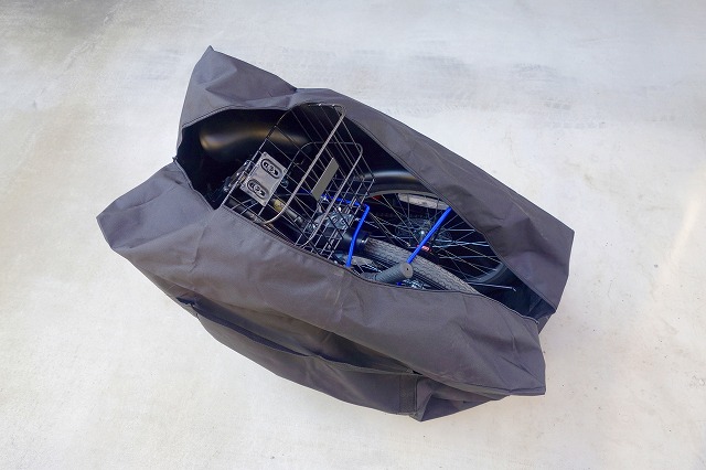 サドルを緩めて逆向きにし、折り畳んでゴムバンドで固定したら、袋にガボッと入れるだけで、ペダルやカゴはそのままです。